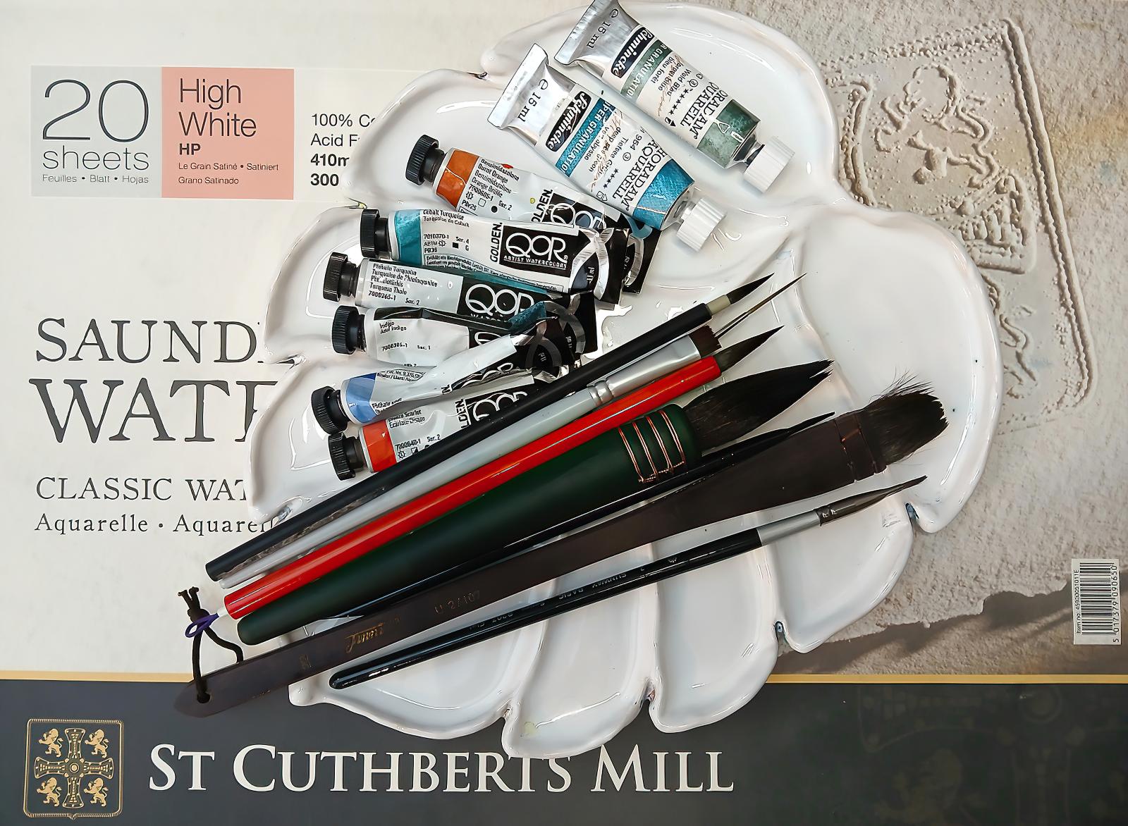 Используйте любые профессиональные акварельные краски в кюветах или тубах. Рекомендуемые бренды: QoR, Schmincke, Winsor & Newton, Rosa, Roman Szmal Aquarius, Talens Van Gogh, Renesans, Nevskaya Palitra