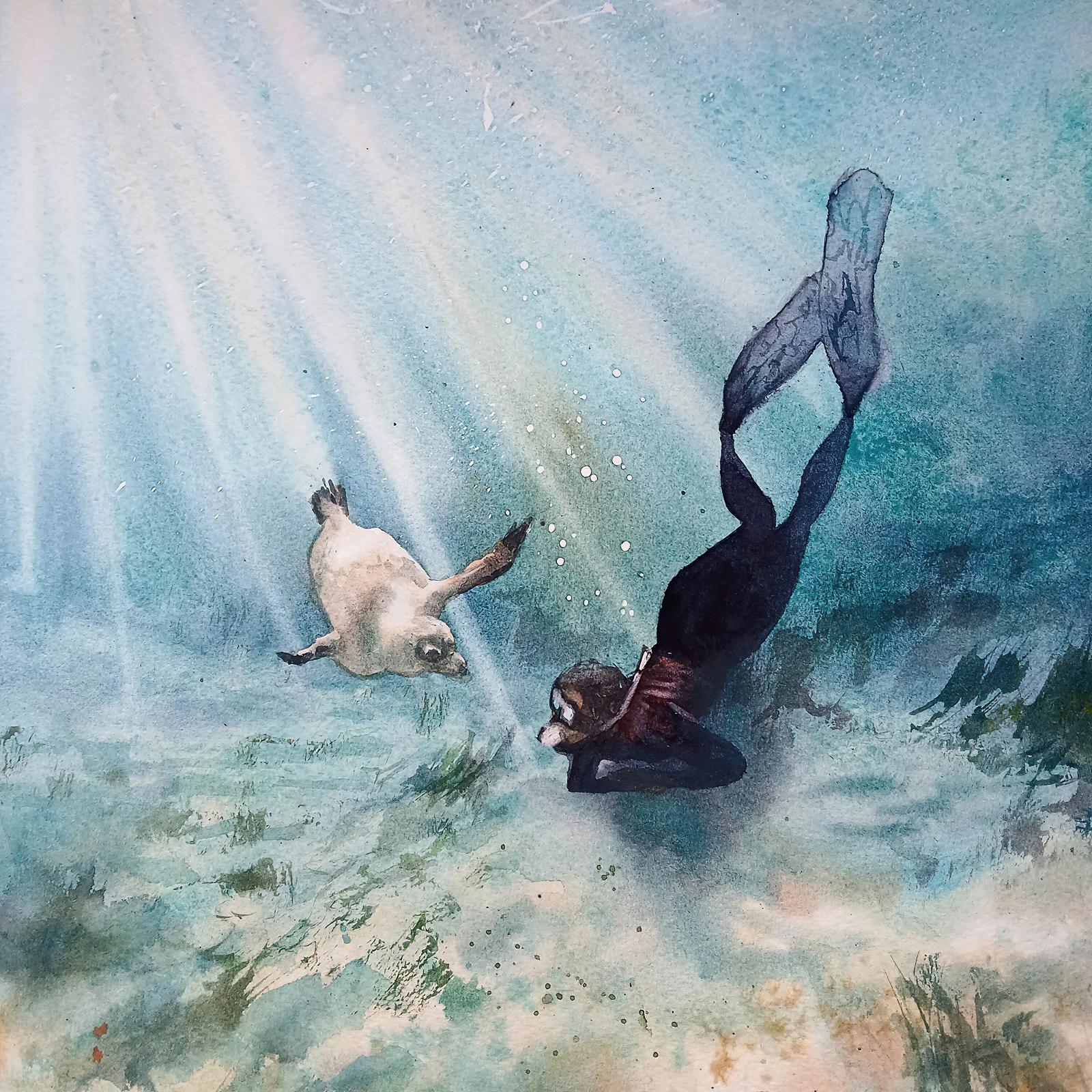 Мы нарисуем спокойную встречу дайвера и тюленя под водой, учась передавать глубину и движение с помощью света и цвета.