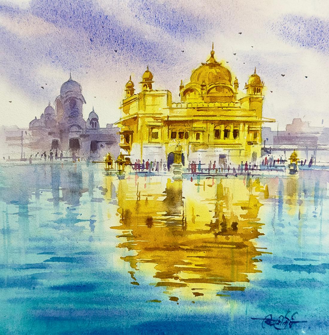 Начнем наш курс с прекрасного Золотого храма. Это величественный памятник, окруженный водой. Мы передадим структуру воды с помощью подвижного отражения.