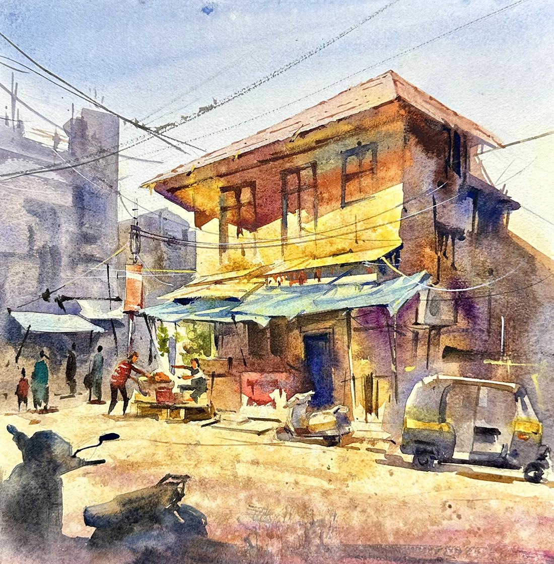 Посмотрите на этот интересный городской сюжет, который мы сегодня нарисуем. Мы будем использовать сильный свет и тени, чтобы подчеркнуть особенности этого старого, но атмосферного индийского рынка.
