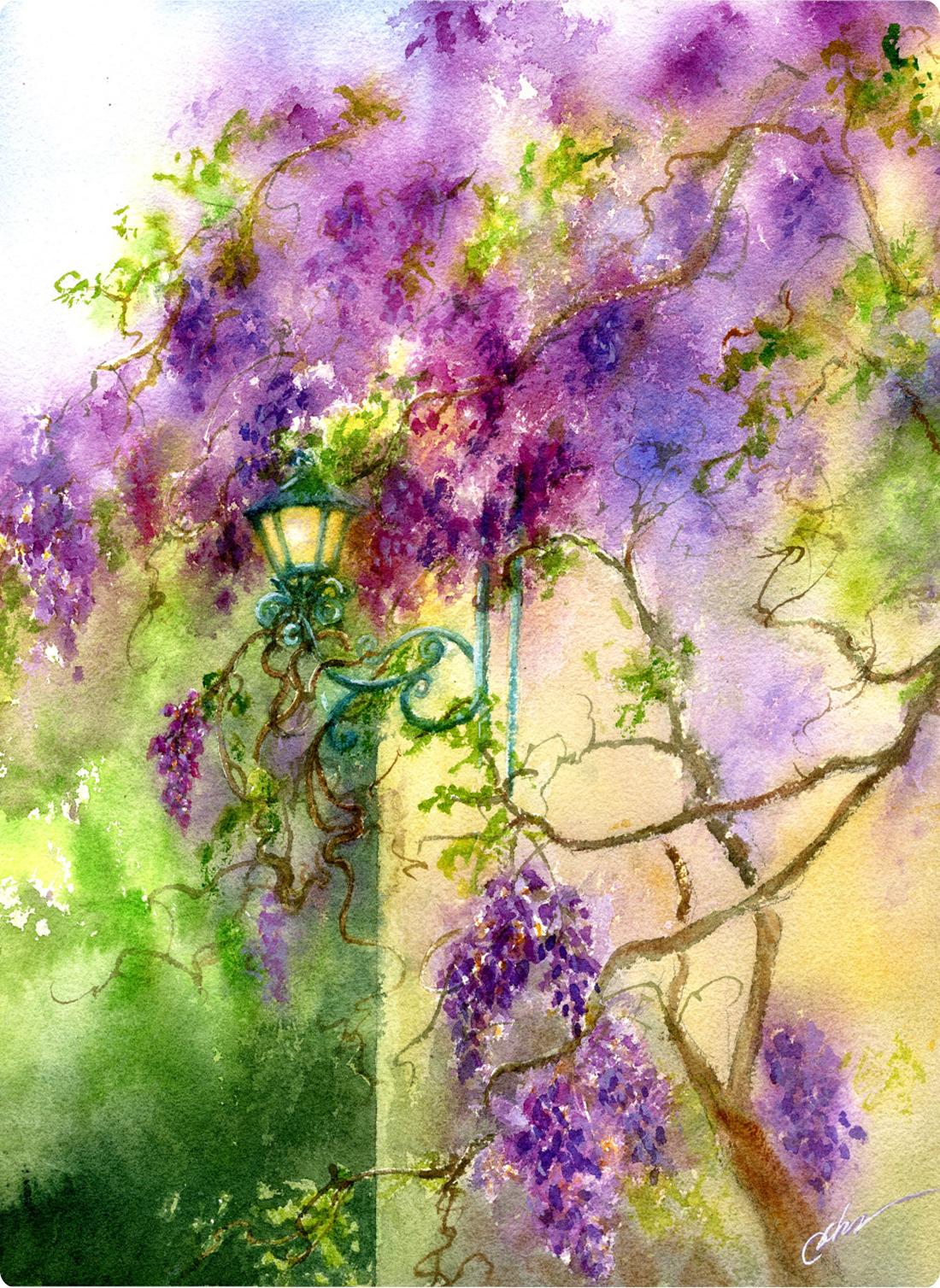 Рисовать глицинии акварелью — это и красиво, и увлекательно, ведь их нежные, ниспадающие цветы и воздушная природа самого растения отлично сочетаются с прозрачностью и текучестью акварели.
