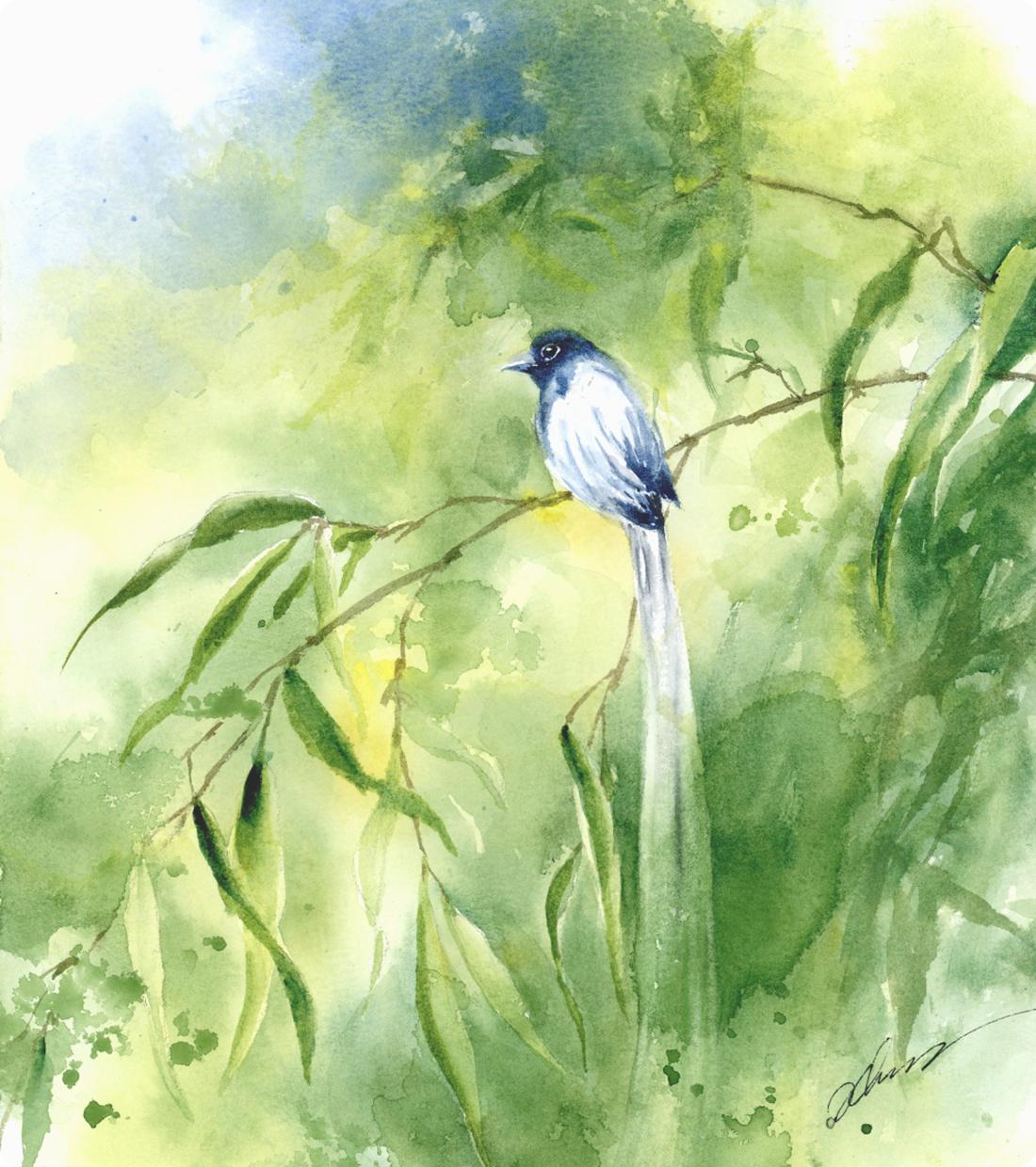 Эта птица с красивым длинным хвостом — не настоящая. Я думаю, она фея. Она одинока, изящна и наслаждается спокойным моментом.