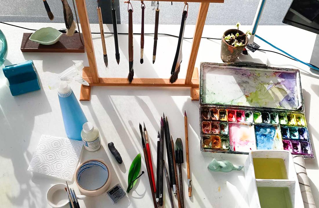 - 3 круглые акварельные кисти — примерно №6 и №10 с острым кончиком. Маленькая жёсткая плоская кисть. Большая плоская кисть. Отдельная кисть только для воды.